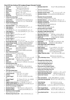 Dokumen tersebut berisi kode-kode cheat untuk game GTA San Andreas PS2 yang dapat membuka berbagai item seperti senjata, kendaraan, kemampuan karakter, dan lainnya. Kode-kode tersebut terdiri dari kombinasi tombol kontroler PS2. Original Title 364014774-Cheat-GTA-San-Andreas-PS2-Lengkap-Dengan-Petunjuk-Tombol.docx