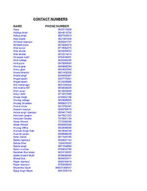 The document contains a list of names and phone numbers. There are over 100 entries that provide contact information for various individuals through their names and phone numbers. The list seems to cover contacts from various cities and organizations.