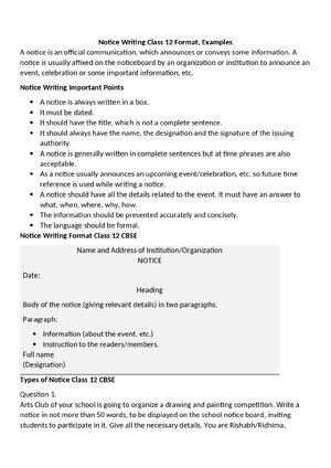 Notice Writing Class 12 Format – Free download as Word Doc (.doc / .docx), PDF File (.pdf), Text File (.txt) or read online for free.