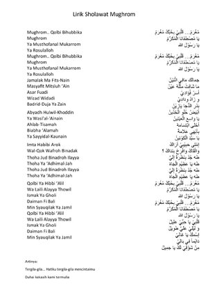 Berikut lirik Sholawat Mughrom dalam tulisan Arab, Latin, dan artinya, yang mengisahkan tentang hati yang tergila-gila mencintai Nabi Muhammad SAW.
