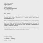 Resignation letter template for a formal departure from a job position. Hernán Alvarez expresses gratitude for the opportunities and professional growth experienced at Industries Salem. The letter includes contact information and willingness to facilitate a smooth transition of responsibilities. Address: Colon 23-2, Manizales. Contact: +57 321 234 5678. For a comprehensive guide on resignation letters, visit hola sitioincreible.co.