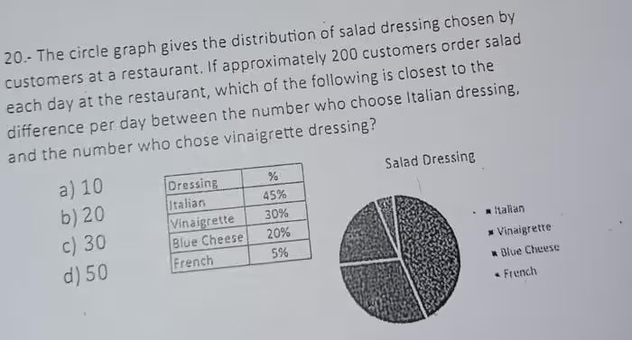 20.- The circle graph gives the distribution of salad dressing chosen by customers at a restaurant. If approximately 200 customers order salad each day at the restaurant, which of the following is closest to the difference per day between the number who choose Italian dressing, and the number who chose vinaigrette dressing? a) 10 Salad Dressing b) 20 Italian c) 30 Vinaigrette d) 50 Blue Cheese French