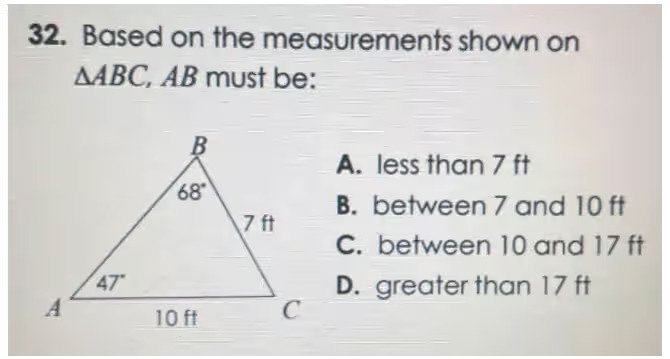 Since \( AB \approx 9.82 \), it falls between 10 and 17 ft, making option C correct.