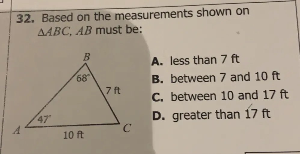 Since \( AB \approx 9.82 \) ft, it falls between 7 and 10 ft. Thus, the correct answer is B. between 7 and 10 ft.