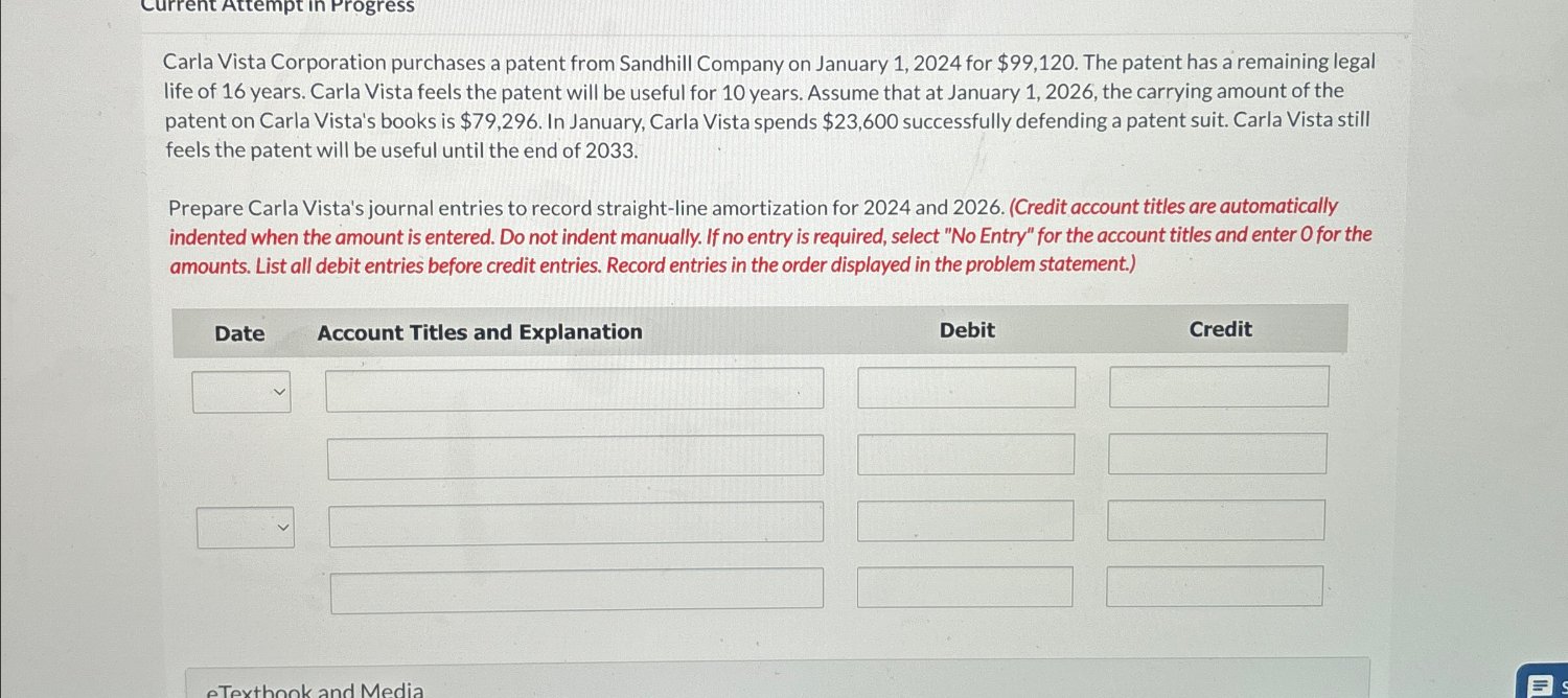 Carla Vista Corporation purchases a patent from Sandhill Company on January 1, 2024 for 99,120. The patent has a remaining legal life of 16 years. Carla Vista feels the patent will be useful for 10 years. Assume that at January 1, 2026, the carrying amount of the patent on Carla Vista's books is 79,296. In January, Carla Vista spends $23,600 successfully defending a patent suit. Carla Vista still feels the patent will be useful until the end of 2033. Prepare Carla Vista's journal entries to record straight-line amortization for 2024 and 2026. (Credit account titles are automatically indented when the amount is entered. Do not indent manually. If no entry is required, select "No Entry" for the account titles and enter 0 for the amounts. List all debit entries before credit entries. Record entries in the order displayed in the problem statement.) Date Account Titles and Explanation Debit Credit