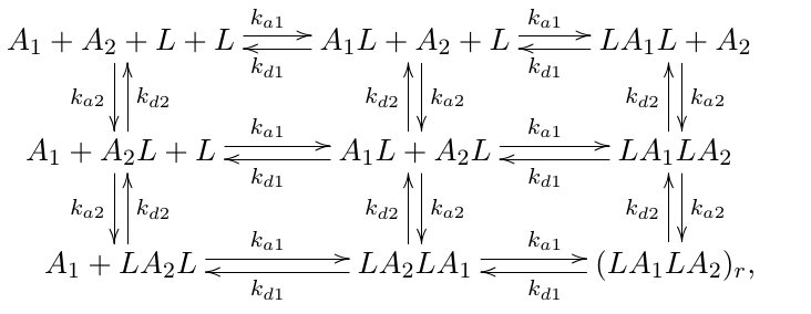 - The reactions involve the formation and dissociation of complexes like $A_1L$, $A_2L$, and their combinations, with rate constants $k_{a1}$, $k_{a2}$ (association), and $k_{d1}$, $k_{d2}$ (dissociation).