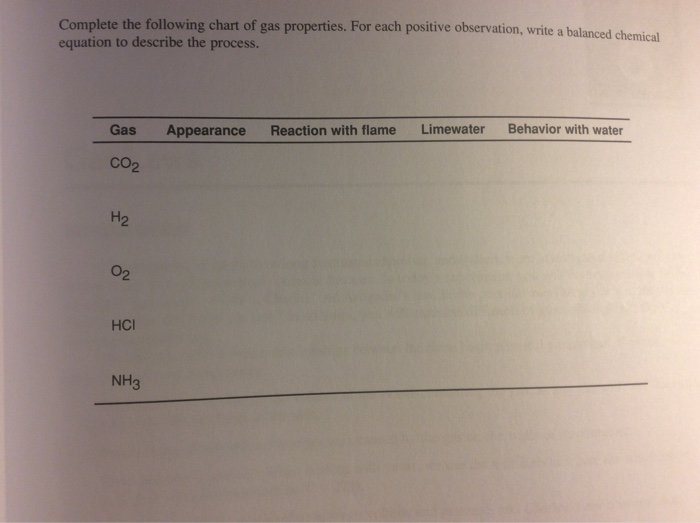 Complete the following chart of gas properties. For each positive observation, write a balanced chemical equation to describe the process. Gas Appearance Reaction with flame Limewater Behavior with water CO₂ H₂ O₂ HCl NH₃