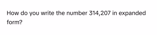 The number 314,207 in expanded form is: $300,000 + 10,000 + 4,000 + 200 + 0 + 7$.