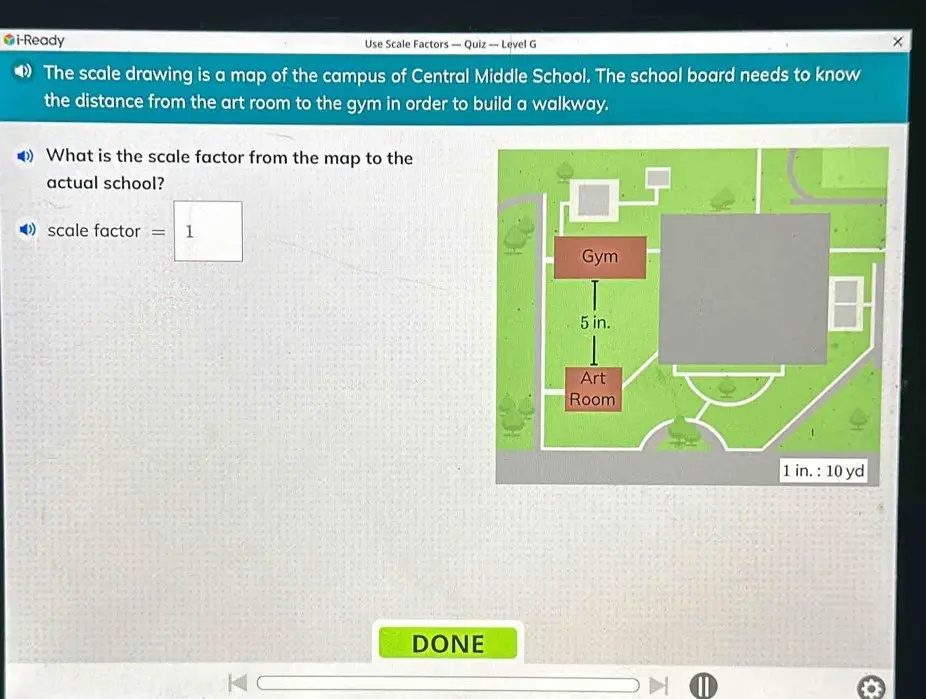 To find the scale factor, we need to compare the distances on the map to the actual distances. We know that the distance from the art room to the gym on the map is 1 inch, and the actual distance is 10 yards. Since 1 yard is equal to 3 feet, and 1 foot is equal to 12 inches, we can convert 10 yards to inches by multiplying by 3 and then by 12.