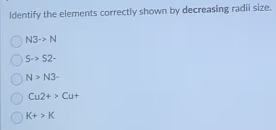 Identify the elements correctly shown by decreasing radii size. N3to N S->S2- N>N3- Cu2+>Cu+ K+>K