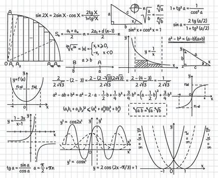 This image contains various mathematical concepts, primarily centered around trigonometry, calculus, and algebra. Key theorems and formulas involved include the Pythagorean theorem (for right triangles), trigonometric identities (such as \(\sin^2 x + \cos^2 x = 1\), double angle formulas, and sum-to-product formulas), and calculus principles like derivatives (for analyzing slopes and rates of change) and integrals (for calculating areas under curves). The graphs depict sinusoidal functions, quadratic functions, and their derivatives, illustrating how these concepts are interconnected.