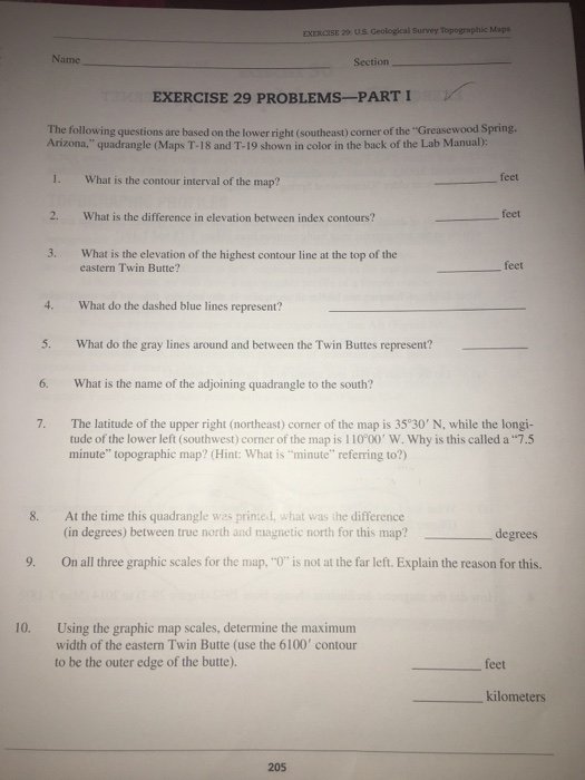 Name ___________________________ Section ___________________________ EXERCISE 29 U.S. Geological Survey Topographic Maps EXERCISE 29 PROBLEMS—PART I The following questions are based on the lower right (southeast) corner of the “Greasewood Spring, Arizona,” quadrangle (Maps T-18 and T-19 shown in color in the back of the Lab Manual): 1. What is the contour interval of the map? __________ feet 2. What is the difference in elevation between index contours? __________ feet 3. What is the elevation of the highest contour line at the top of the eastern Twin Butte? __________ feet 4. What do the dashed blue lines represent? _______________________________________ 5. What do the gray lines around and between the Twin Buttes represent? _______________________________________ 6. What is the name of the adjoining quadrangle to the south? _______________________________________ 7. The latitude of the upper right (northeast) corner of the map is 35°30′ N, while the longitude of the lower left (southwest) corner of the map is 110°00′ W. Why is this called a “7.5 minute” topographic map? (Hint: What is “minute” referring to?) 8. At the time this quadrangle was printed, what was the difference (in degrees) between true north and magnetic north for this map? __________ degrees 9. On all three graphic scales for the map, “0” is not at the far left. Explain the reason for this. 10. Using the graphic map scales, determine the maximum width of the eastern Twin Butte (use the 6100′ contour to be the outer edge of the butte). __________ feet __________ kilometers 205