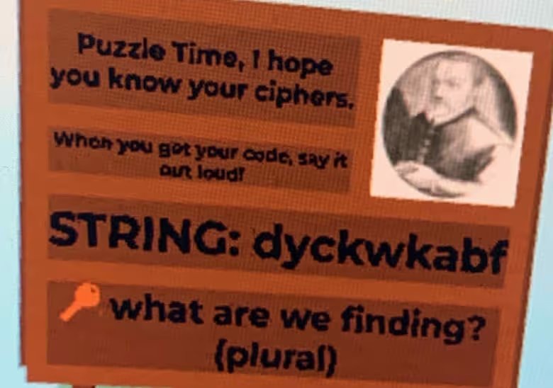 • Puzzle Time, I hope you know your ciphers. When you get your code, say it out loud! STRING: dyckwkabf 🗝️ what are we finding? (plural)