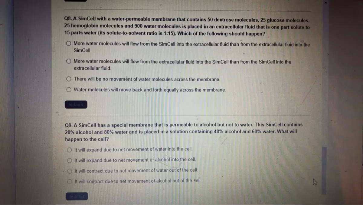 Q9: Alcohol will diffuse into the SimCell until alcohol concentrations equalize (reach ~40% inside); because water cannot cross, the cell will take up alcohol and increase in volume (swell), possibly rupturing if the membrane cannot stretch.