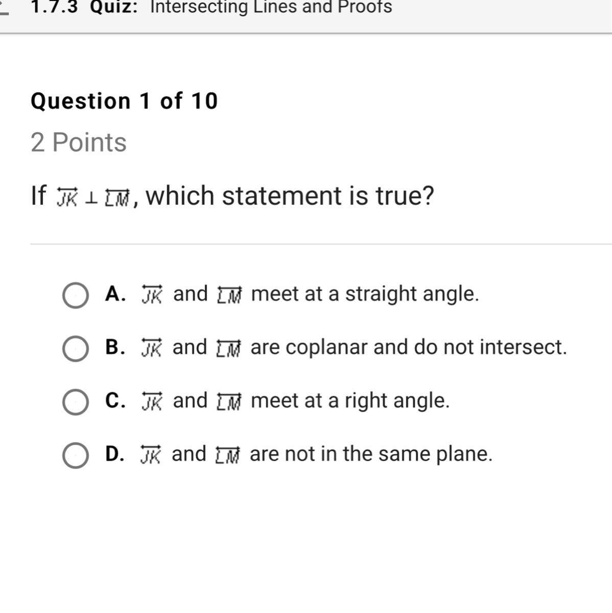 Question 1 of 10 If JK ⟂ LM, which statement is true? A. JK and LM meet at a straight angle. B. JK and LM are coplanar and do not intersect. C. JK and LM meet at a right angle. D. JK and LM are not in the same plane.