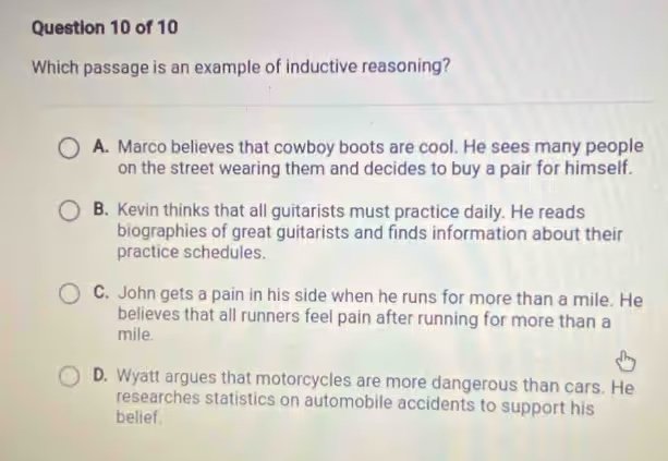 Explanation: Inductive reasoning involves making generalizations based on specific observations or examples. In option A, Marco observes many people wearing cowboy boots and concludes that they are cool, leading him to buy a pair. This is a classic example of inductive reasoning, where a specific observation leads to a broader generalization.