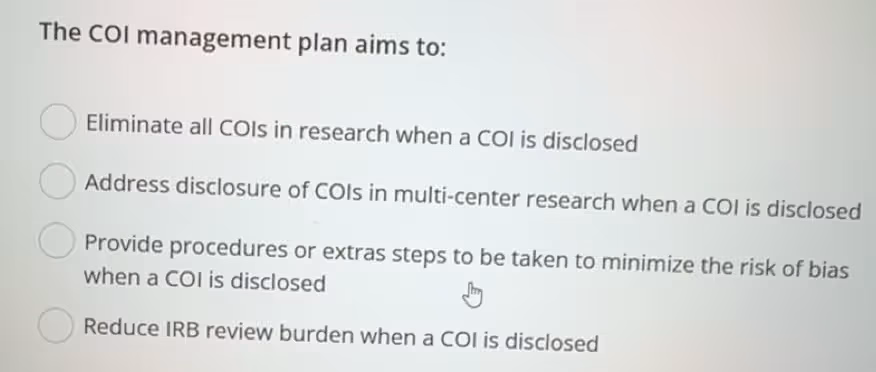A good COI management plan lets the research proceed while ensuring safeguards (e.g., independent statisticians analyze outcomes) so results remain credible and participants are protected.