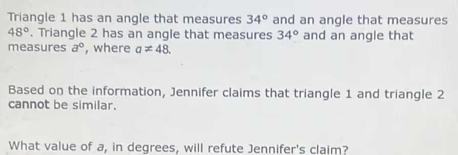 Explanation: For two triangles to be similar, they must have the same angles. Triangle 1 has angles of \(34^\circ\), \(48^\circ\), and \(98^\circ\) (since the sum of angles in a triangle is \(180^\circ\)). Triangle 2 has angles \(34^\circ\), \(a^\circ\), and another angle. To refute Jennifer’s claim, \(a\) must be \(98^\circ\) to match the third angle of Triangle 1.