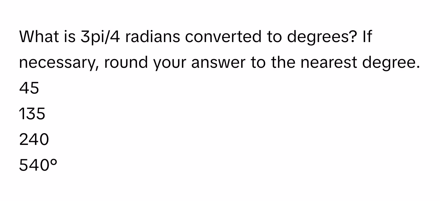 - Start with the conversion: $$\frac{3\pi}{4}\times\frac{180^\circ}{\pi}$$