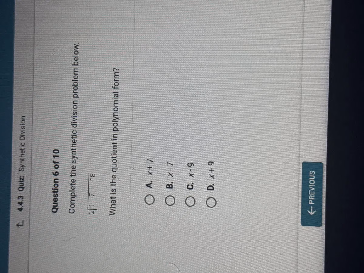• The quotient corresponds to 7 (constant, since original polynomial was 7x−18, a degree 1 polynomial)