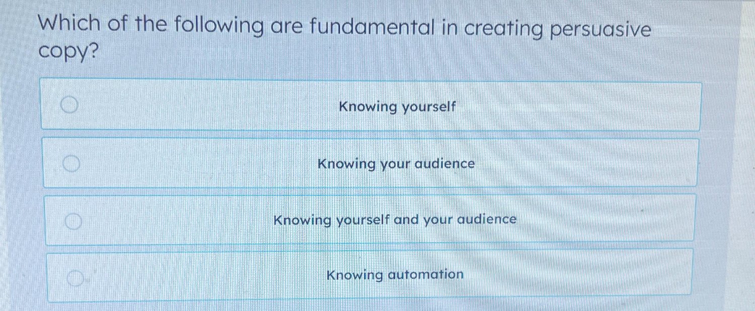Which of the following are fundamental in creating persuasive copy? ○ Knowing yourself ○ Knowing your audience ○ Knowing yourself and your audience ○ Knowing automation