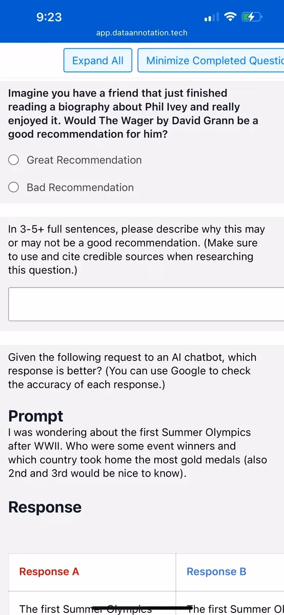 The short answer: I can’t pick which response is better yet — I need the two chatbot responses to compare, and I need more info about “him” (his reading tastes) and the specific sporting event/year you mean for the medal question.